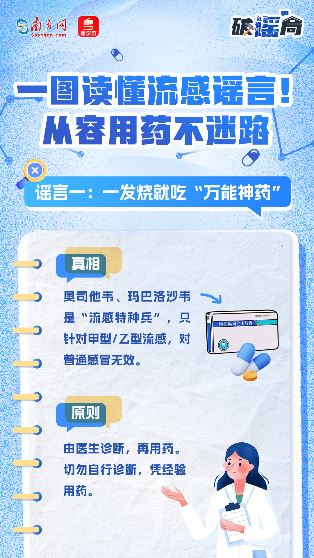 秋冬季节来临,全国流感进入快速增加期。孩子们聚集在医院,“马巴洛沙韦”、“奥司他韦”成为家长群体中的高频词。有的人吃一次就退烧,但有的人却吐得更多;有的人把两种药混用,有的人退烧就停药……看了家长们常见的误区,我一图给你看懂关于流感的谣言,让你从容服药,不迷失。面对流感,家长要牢记“四步安全用药法”。面对小儿流感,家长应遵循“先诊断、抓住时机、考虑年龄、避免禁食”的四步安全用药方法,以达到安全有效的治疗。先明确诊断。发烧不是流感唯一指征,治疗必须“有针对性”;抓住机会出现症状后48小时内服药,越早越好;根据年龄不同,1岁以下(2周以上)可以服用奥司他韦颗粒,1-5岁可以服用奥司他韦片。 5岁以上儿童经医生检查后可选择服用马巴洛沙韦干混悬剂;儿童在服用马巴洛沙韦前后2小时内应避免摄入牛奶、钙片、铁剂和抗酸剂,以免影响药物疗效。奥司他韦可能会引起胃肠道不适。如果孩子呕吐严重,建议饭后或饭后服用,以减轻瘙痒。注意:如果出现特定症状,需要立即就医。用药期间,家长需要严格观察孩子的病情变化。如果孩子出现以下任何症状,应立即就医:服药后30分钟内出现大量呕吐(Ma巴洛沙韦应进行重复剂量测试);精神萎靡、嗜睡、站立不稳或行走不稳等症状;呼吸急促、嘴唇发紫等症状;皮疹迅速增加,并伴有面部肿胀和疲劳。此时,应警惕过敏反应。基本策略:预防胜于治疗。最后,抗流感病毒药物就像“消防队”,给儿童接种流感疫苗是筑起“防火墙”的最有效方法。药物不能代替疫苗,疫苗也不能100%预防所有菌株。两者相辅相成,为儿童提供最可靠的保护,让他们安全度过流感季节。