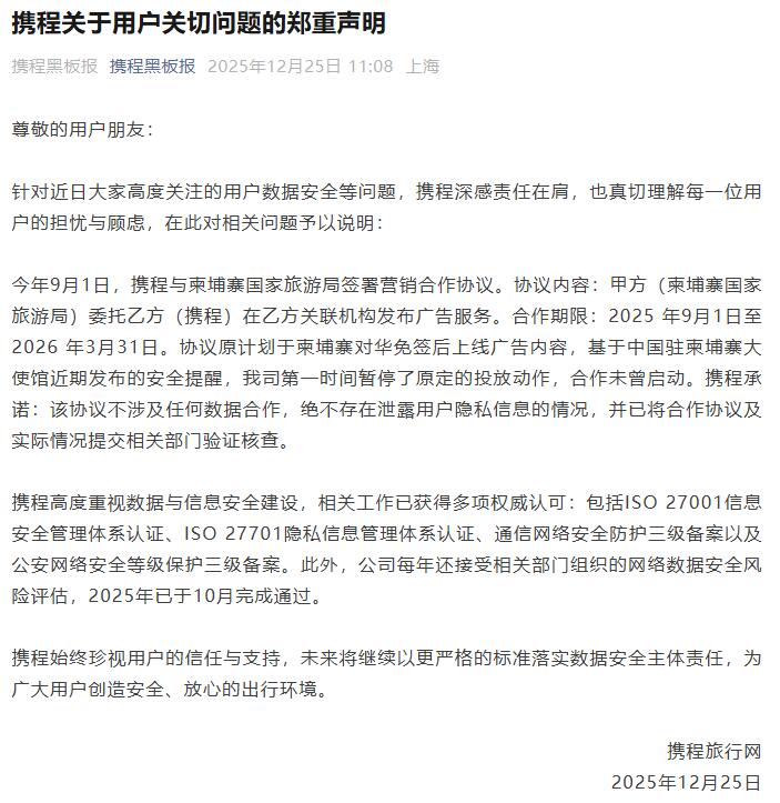 12月25日,携程发布声明称,针对近期备受关注的用户数据安全等问题,现对相关问题进行说明:今年9月1日,携程与柬埔寨国家旅游局签署营销合作协议。协议内容:甲方(柬埔寨国家旅游局)委托乙方(携程网)在乙方所属机构发布广告服务。合作期限:2025年9月1日至2026年3月31日。该协议原计划在柬埔寨免签中国后推出广告内容。基于近期中国驻柬埔寨大使馆发布的安全警告,我司立即暂停了原有的广告行动,目前尚未展开合作。我向携程保证,本协议不涉及任何数据共享,绝不会出现任何用户隐私信息泄露的情况。时间合作协议及实际情况报相关部门审核核实。