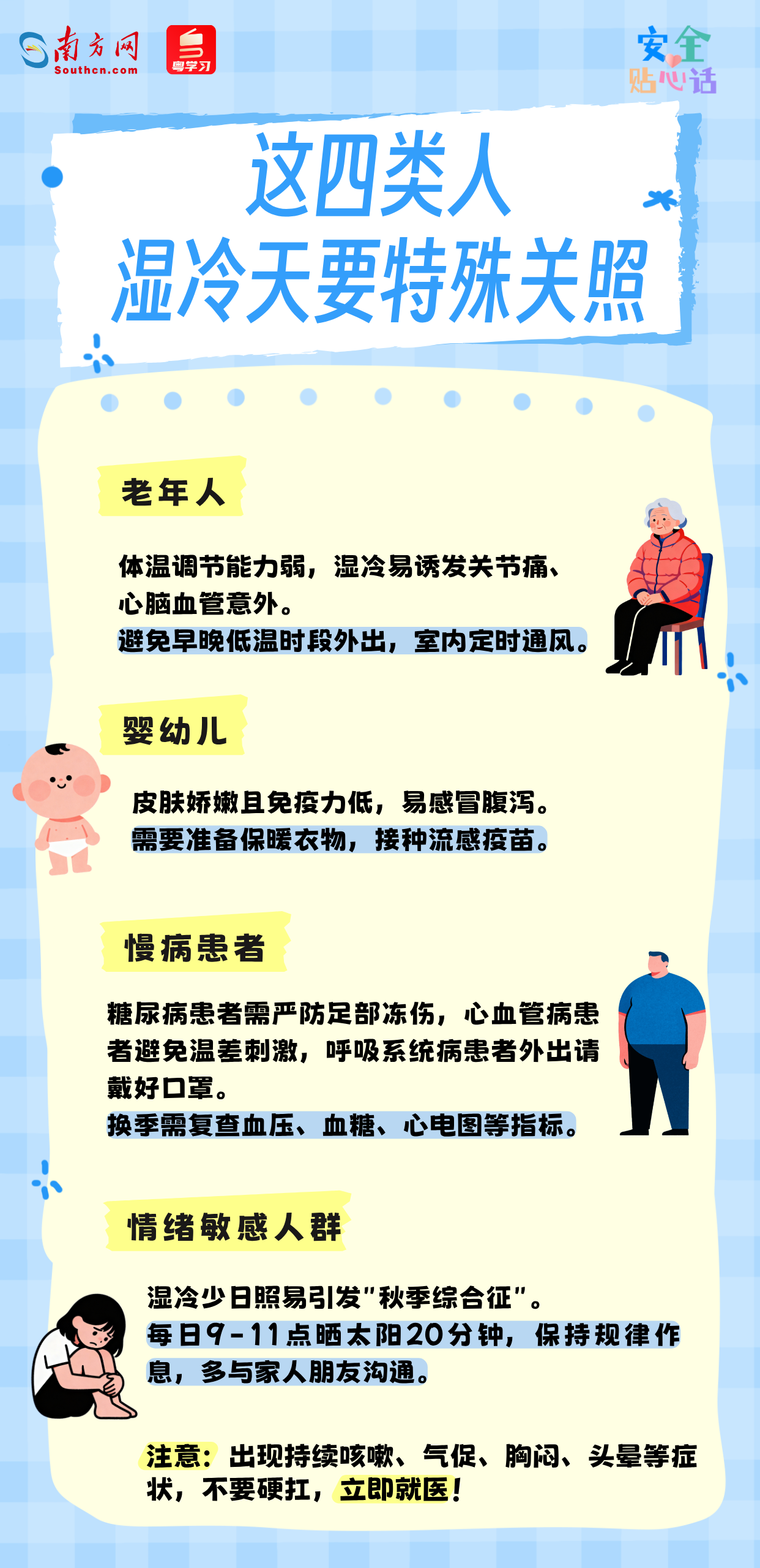 据广东省气象台预报,11月17日上午起,一股北方强冷风将自北向南影响广东。11月18日至19日,全省气温将大幅下降6至10℃,其中广州气温将降低10至16℃。大部分地区将出现阴雨天气,有小雨,陆地阵风可能达到5-7级。与干冷条件不同,湿冷环境中的感知温度低于实际温度,这对老人、儿童和慢性病患者构成更大的威胁。如何保护自己免受寒冷和潮湿天气的影响?吃什么可以温暖身体?一组海报就懂了。统筹:策划、陈海民 设计:世轩