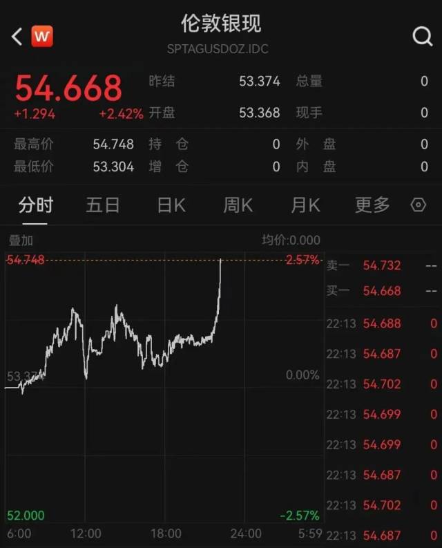11月28日晚间,现货白银上涨逾2%至54.668美元/盎司,创历史新高;上海证券交易所上海白银期货上涨逾2.5%,再创历史新高。现货黄金也加速上涨,当日上涨0.82%,目前交投于4191.03美元/盎司。