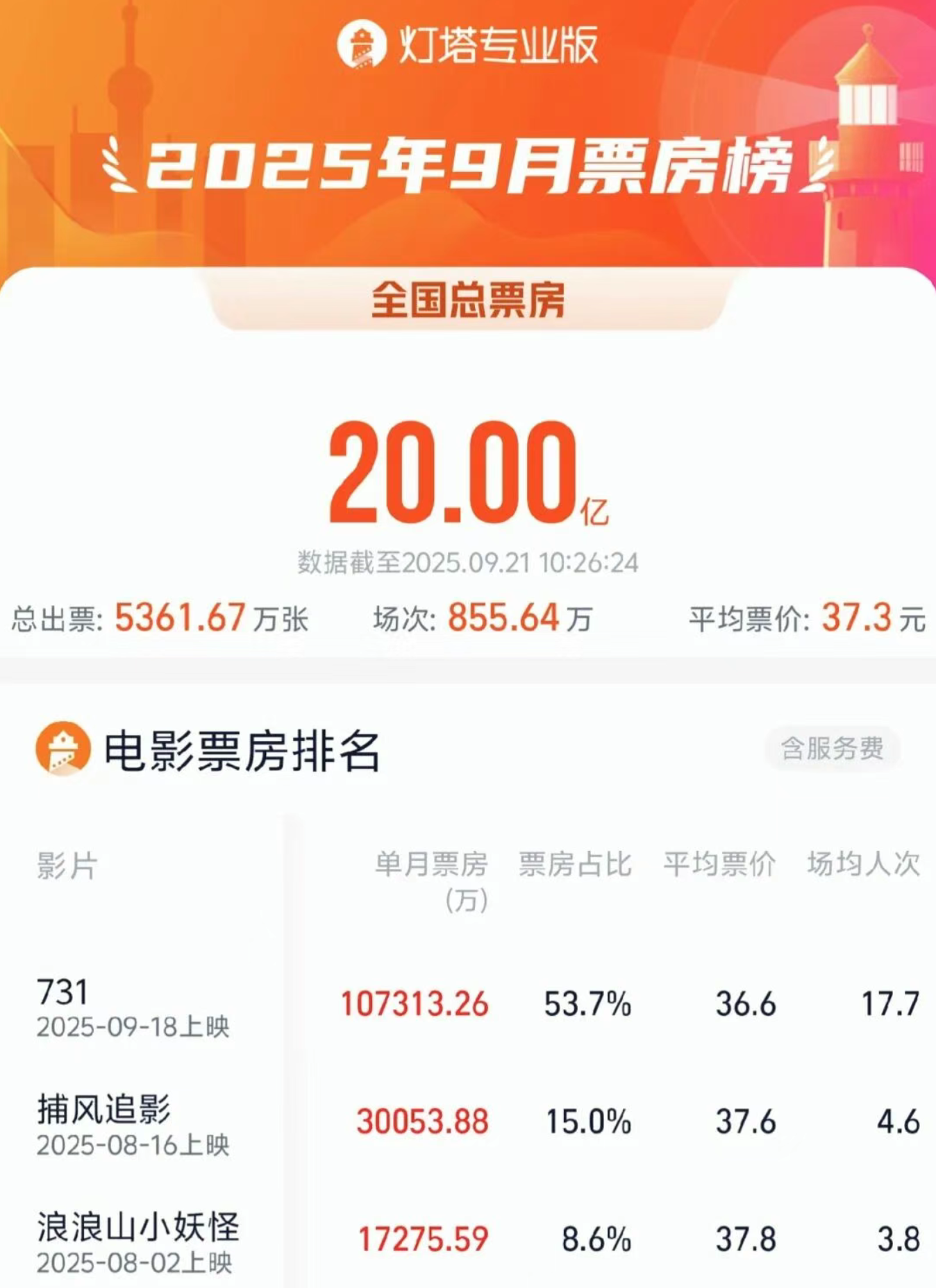 根据灯塔专业版的实时数据,现在(21日),票房(带有预售)在2025年9月(带有预售)超过20亿元人民币,破坏了中国电影历史上9月的票房记录。其中,例如出版时间,“ 731”票房超过12亿元人民币。资料来源:广东学习记者朱的灯塔应用程序南部网络