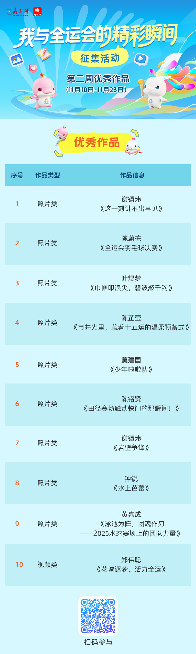 十五运余热未散,南方新闻网主办的“全运我的精彩瞬间”征集活动正进入激烈阶段,目前已征集作品近千幅。第二期周评聚焦赛场上的精彩瞬间,精选田径、羽毛球、水球、攀岩四大主项以及观众中感人的场景,共评选出10部优秀作品。他们清晰地展现了运动员们的英勇拼搏精神、团队的默契配合和观众的热情支持,让十五运会的动人辉煌在赛场外继续闪耀。第二期余下作品清单《我不说再见,沙子就是这一刻》《我不会说再见,这一刻》定格了苏炳添在赛道上冲刺的身影,也记录了他“杭金”的告别瞬间。从首次突破十秒大关的辉煌,到致力于培养新一代运动员,苏炳添始终严谨执着。退役不是结束,田径梦想仍在继续——这份不变的热爱将继续照亮赛道的每一个角落。全运会《全运会羽毛球决赛》精准捕捉了运动员起跳、挥舞武器的瞬间动作。羽毛球一旦“划破”空气,清脆的击球声仿佛就在观众耳边响起,场面气氛浓厚。作品将竞技的紧张感、科技之美和体育精神的内涵融为一体,定格了精彩。 《青春啦啦队》《青春啦啦队》聚焦于观众席上的两位年轻啦啦队员。他们身着制服,举着小红旗、拍手机,脸上挂着灿烂的笑容,随着农场的节奏大声喊叫、挥舞手臂。在他们身后,体育场璀璨的灯光、海浪般一成不变的观众人数、激烈的比赛氛围交织在一起,宣读了国运“全民参与、健康生活”的主旨理念。 《水上芭蕾》钟锐的《水上芭蕾》捕捉了运动员动作的细节,展现了运动员们默契的配合和激烈的拼搏。作品不仅展现了体育运动的激烈程度和艺术的高雅,更提供了力与美兼备的体育运动的独特之美。以下为本期其他优秀作品:谢振伟的《岩石上的战斗》和陈明贤的《快门触及田径场的那一刻!》 》叶雨萌《女子敲浪,碧波汇聚》黄家成《泳池是阵,魂是刀——2025年的团队力量》马球比赛后》陈志英“十五运会的温柔备战隐藏在市场的光芒下”郑伟聪“花城逐梦,活力全运”无论是赛场内的比赛场景,还是赛场外的感人瞬间,都值得记录和分享。活动仍在进行中,网友们请登录广东留学客户端,点击右下角“我的”页面,参与热门活动。也可直接点击活动官网一键进入。