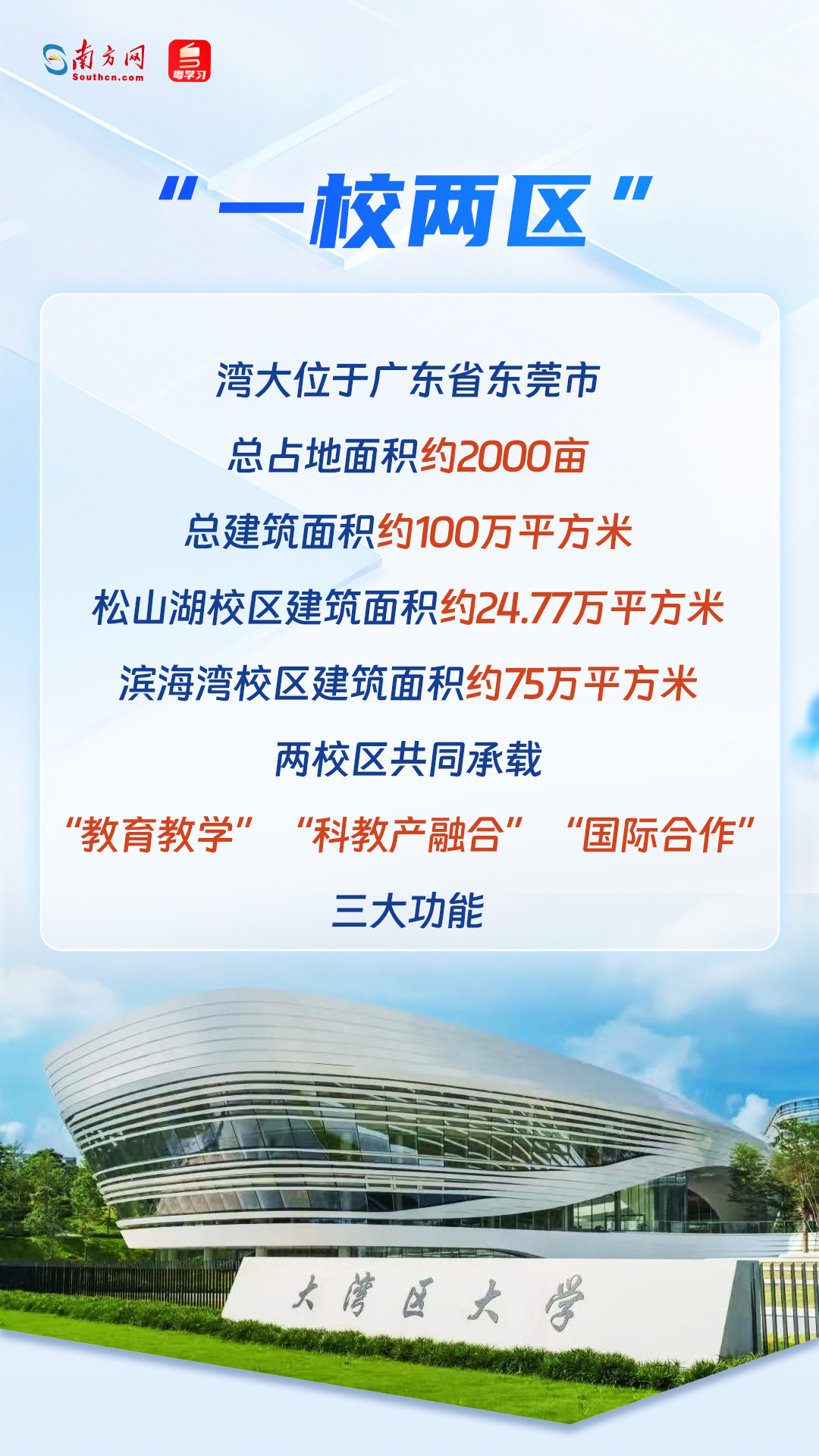 12月6日,大湾区大学(以下简称“湾大学”)在广东东莞松山湖校区召开大会,标志着以理工科为主的新型研究型大学正式挂牌。今年6月19日,广东省教育部正式回应,同意设立粤港澳大湾区大学。从“筹”到“立”再到“立”,湾大学超越“大湾区速度”。今年8月,学校正式开学。首批录取的80名新生来自广东16个市的53所中学,在新大学开始了新的人生旅程。一组海报了解湾大学↓agan