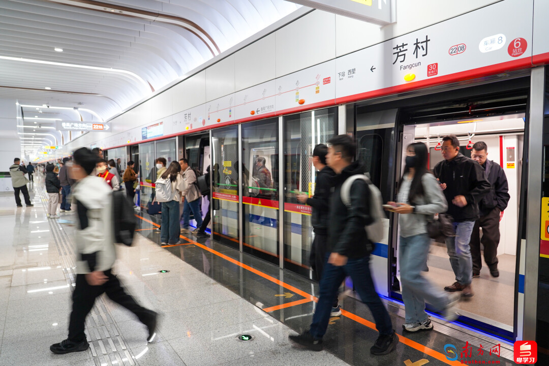 从12月29日首趟列车开始,广州地铁22号线后段正式开通运营。 22号线猴硐段(陈头岗-芳村)全长11.5公里,自南向北设南浦西、南召、西龙、芳村4个车站。西龙站可换乘1号线、10号线、广佛线,芳村站可换乘1号线、11号线,乘客可根据车站引导换乘。据悉,22号线全长29.7公里。该线路定位为火车南站快线,时速160公里。共有车站8座,其中换乘站4座。采用单次换乘模式,全程运行时间约27分钟。工作日高峰时段,该线路共开行13趟列车,发车间隔约4分50秒。这条新线开通,连接G西部和南部的快速轨道交通广州已实现,广州南站交通枢纽综合功能不断完善。在连接广州南站和白鹅潭两大主要枢纽中也发挥着重要作用。开业当天上午,不少市民来到新线品尝“头鱼汤”。家住花地湾站附近的李先生表示,去广州南站之前,他一般都是乘坐地铁1号线,从花地湾到公园前站,再从公园前站换乘2号线到达广州南站。整个行程耗时50分钟;现在22号线带大家线路开通后,李先生说:“我去广州南站需要半个小时,我从花地湾坐1号线到芳村,再从芳村换乘22号线到广州南站,全程只需要25分钟左右。” 22号线后通道段车站服务设施持续完善达到近年来新开线路的标准。每个车站均设有公共卫生间、母婴公共休息室和第三卫生间,并配备婴儿护理桌和休息椅,为家庭和有特殊需要的乘客提供私人空间。值得一提的是,南浦西站、芳村站非付费区域增设公厕,进一步方便旅客使用。此外,各站智能客服中心还专门设置了低层服务台,方便需要办理业务的旅客,真正实现“无缝、温馨”的出行体验。为庆祝新线开通,广州地铁在芳村站、西龙站精心布置了大型花卉主题景观和打卡点。开业期间,吉祥物悠悠(YOYO)和悠悠的邻居们会四处巡游,乘客们会愉快地互动、拍照。因阿迪记者了解到,10号线中大南门站、3号线海永路站C出口、10号线工业大道南站B出口已于当天开通室外运营。