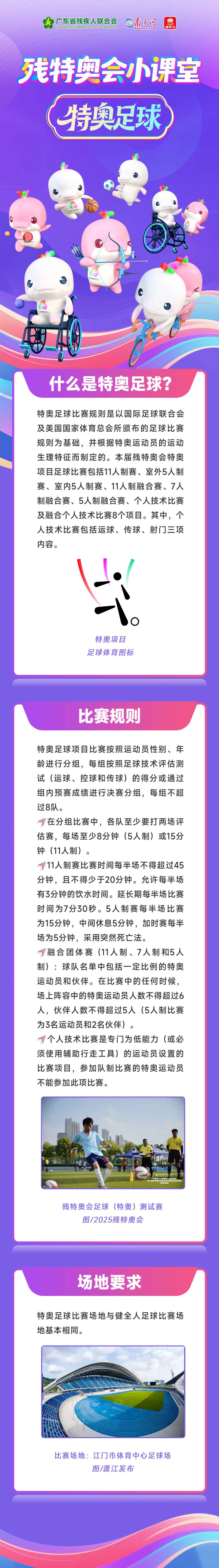 体育运动可以帮助残疾人锻炼身体并获得自信。通过体育,他们可以挑战自我,找到人生价值,与社会紧密相连,绽放自我。 2025年全国残奥会由粤港澳三地联合主办,比赛共设46个主项目、48个分项目。 《特奥残奥小课堂》栏目现已上线,为残疾人讲解体育项目,帮助您了解这些充满爱与力量的残疾人体育项目!没有“不可能”的标签,只有“我能做到”的坚持。特奥足球场上的每一次奔跑都充满了爱。这份科普指南将帮助iyor了解特奥足球的专属规则。 ↓ 阿甘